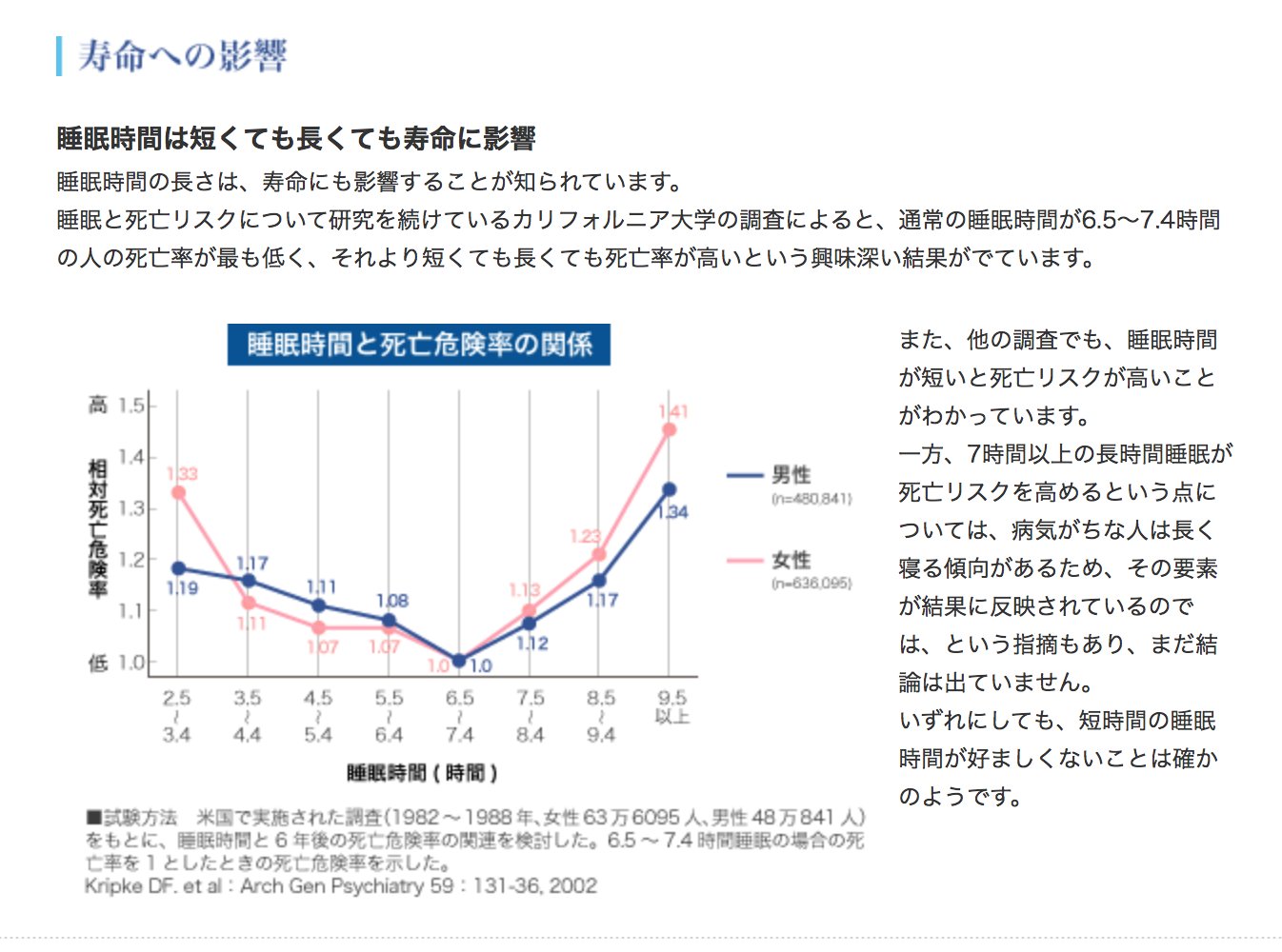 Takayuki Kubo On Twitter では睡眠時間と寿命の相関関係を調べて見ると 下グラフの如くやはり短時間睡眠の方のほうが死亡率が高い ただ睡眠時間が長い人も死亡率が上がるのも事実で これは病弱の人たちが長く眠ることを反映しているのだろうか